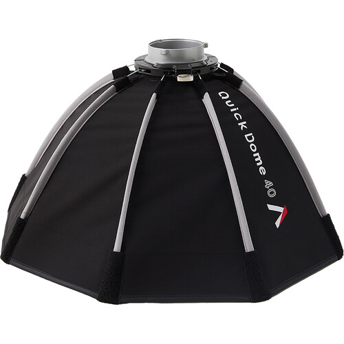 The Quick Dome 40 is a compact circular softbox featuring a parabolic design that is designed to pair with the STORM 80c light fixture. The softbox has a reflective silver interior and provides a soft, even light output.