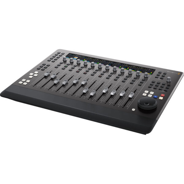 Fairlight Desktop Console is an audio mixing control surface that allows you to mix multiple tracks at once! You get a familiar mixer design with 12 motorized faders, touch sensitive encoder knobs and illuminated buttons. The faders are extremely smooth to move and provide the perfect amount of resistance, allowing subtle adjustments. The console’s controls can be used for functions including pan, solo, mute, dynamics, EQ, plug‑in parameters and more. Each channel strip LCD displays meters, panning, track name and more. An HDMI output gives you instant graphic feedback for all channels, bus and effects from the desktop console.
