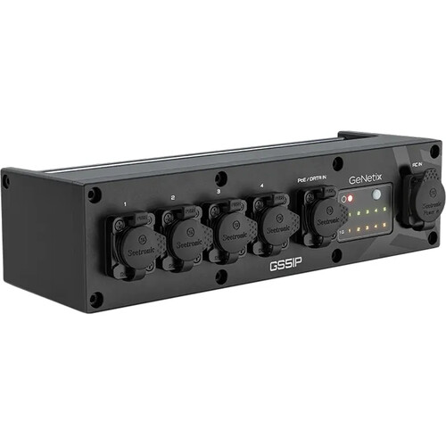 The GeNetix GS5IP (Switch 5IP) is an IP65-rated network switch that provides reliable data distribution in challenging environments. It is “unmanaged,” meaning it works out of the box without complex configuration, duplicating network data (like Art-Net or sACN) across all ports. Its compact, all-weather design makes it ideal for mounting directly onto trussing for festivals, outdoor events, or permanent architectural installations.