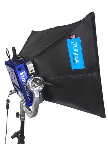 Our [POP] bank increases the aperture of the Creamsource Micro to 16” x 22” (406 mm x 559 mm) more than 4x. The POP bank (p/n 1619) is sold as a kit, with internal baffle, Full and Half Chimera Cloth front screens and is packed in a messenger style bag, all weighing less than 2 lbs (0.9 kg).