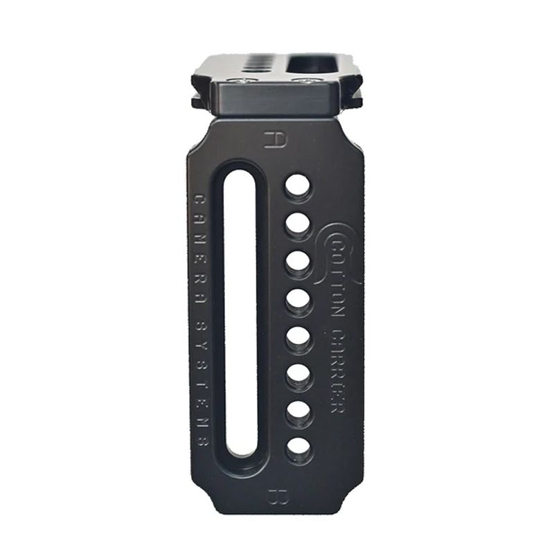 The Cotton Carrier L bracket, provides the adjustable ability to fit most cameras and to solve a wide scope of carrying situations. From the simple function of L bracket use to more complex use of third party tripod plates, gimbal heads and strobe arrangements. Machined of high grade 60/40 anodized aluminum with 14 – 1/4 by 20 threaded holes and generous attachment slots with the ability to reverse the configuration for a more precise fit for different camera body styles and applications. Our NEW L bracket will bring a high quality functional addition to your work flow.
