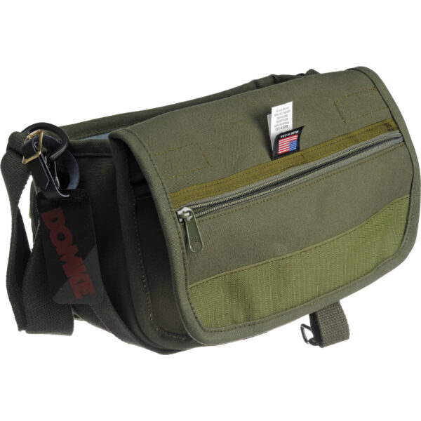 The Domke F-10 JD Medium Canvas Shoulder Bag (Olive Drab) is a cotton canvas bag with interior padding made to carry a small digital or film SLR camera kit with accessories and a point and shoot camera, cell phone, PDA or MP3 player. The bag can be customized by using the included two removable, padded dividers. There is a large exterior front zippered pocket and an upside-down zipper pouch inside the weather flap. The bag is carried by a top handle or an attached, adjustable Gripper Strap that runs completely around the bag.
