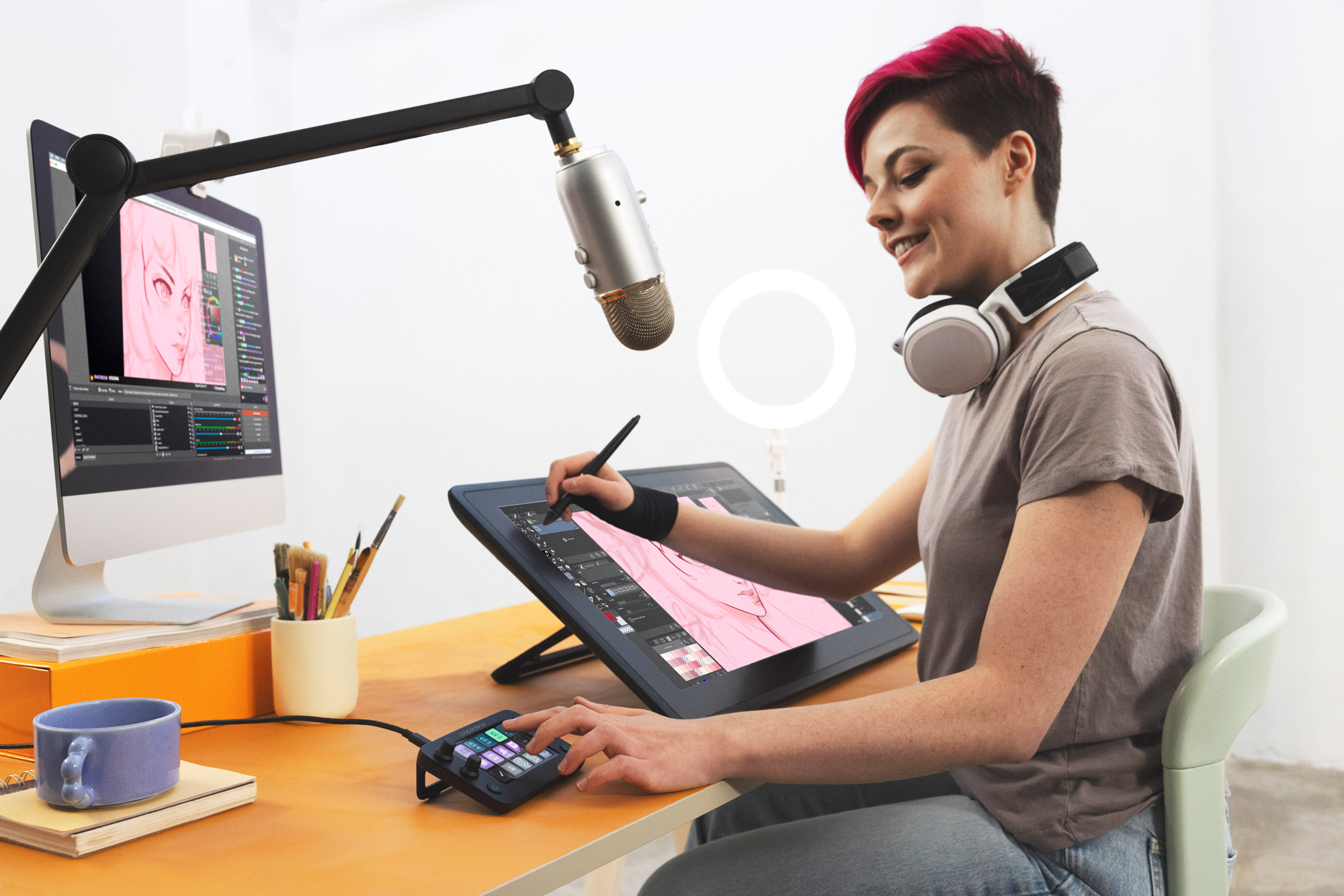 Get hyped as you switch on your mic, camera, lights and launch OBS at the tap of a button. Activate your intro scene and welcome messages as you adjust audio levels with dials. Keep the conversation flowing as you smoothly activate your chatbot, trigger sound effects, launch media and more.