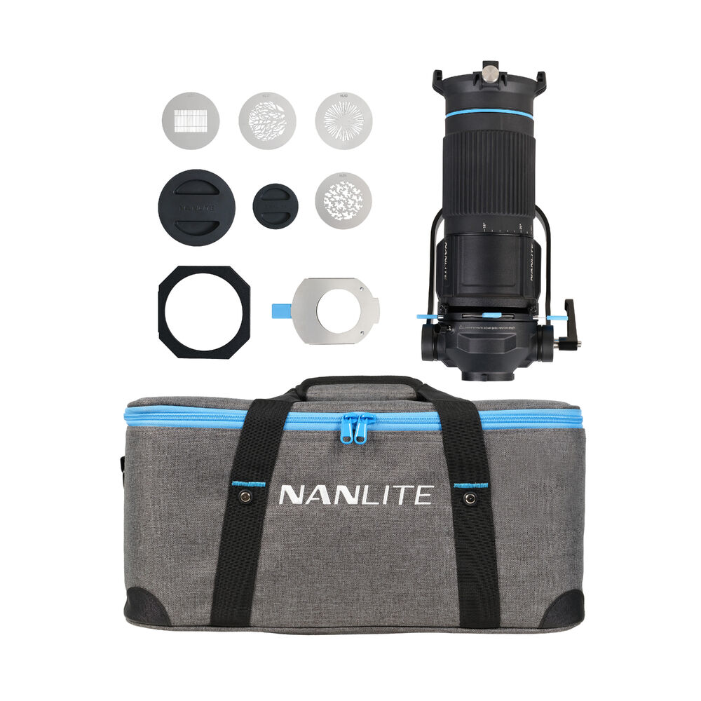 Achieve quality lighting and precise zoom control with the Projection Attachment for FM Mount with 18-36° Zoom Lens from Nanlite. This projection attachment is compatible with select Forza, FC, and FS fixtures with the brand’s proprietary FM mount. It enables a variable 18 to 36° beam angle, with a convenient optical system that increases illumination. Thanks to the 360° rotatable lens barrel, zooming does not require the removal of gobos or shutters. The locking handle allows tilt adjustments to find the exact position needed. A curved yoke offers wide compatibility with 1-1/8″ and 5/8″ optional stands.