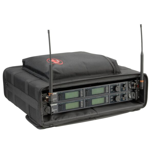 The 14.8 in depth (front rail to back flap) provides plenty of room for the most popular wireless systems. The padded front and back lid has heavy duty zippers that allow for the flaps to open fully and fold underneath. A zippered pouch on the inside front flap provides excellent storage of wireless mic antennae. An ample sized exterior zippered pouch is ideal for cables and/or body packs. Threaded steel rack rails are recessed to provide protection for equipment controls without inhibiting proper antennae placement. These cases are covered by SKB’s one year Soft Product warranty.