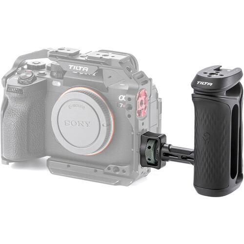 The Tilta Xeno Side Handle (1/4″-20 with Locating Pins) in Black mounts securely on the right or left side of your camera cage, offering improved handheld stability, thanks to its captive screw with two anti-twist pins. It has a comfortable, nonslip silicone grip and can be adjusted vertically up to 1.6″ for optimal placement. The handle has one shoe mount and three anti-twist 1/4″-20 threads for mounting accessories, and it comes with a magnetic 3mm Allen key.