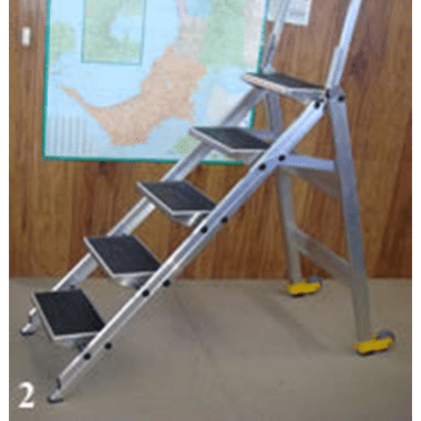 4. Optional: Set of 4 practical rubber-tyred castoring wheels. The ball-bearing fitted wheels are spring mounted so that the wheels retract under load, ensuring stable standing when the Safety Steps are in use.