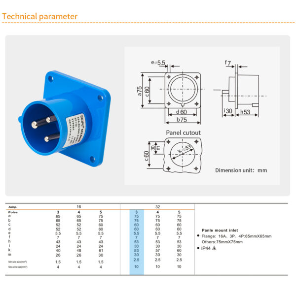 ◆ Flange:16A,3PIN,4PIN:65mm*65mm